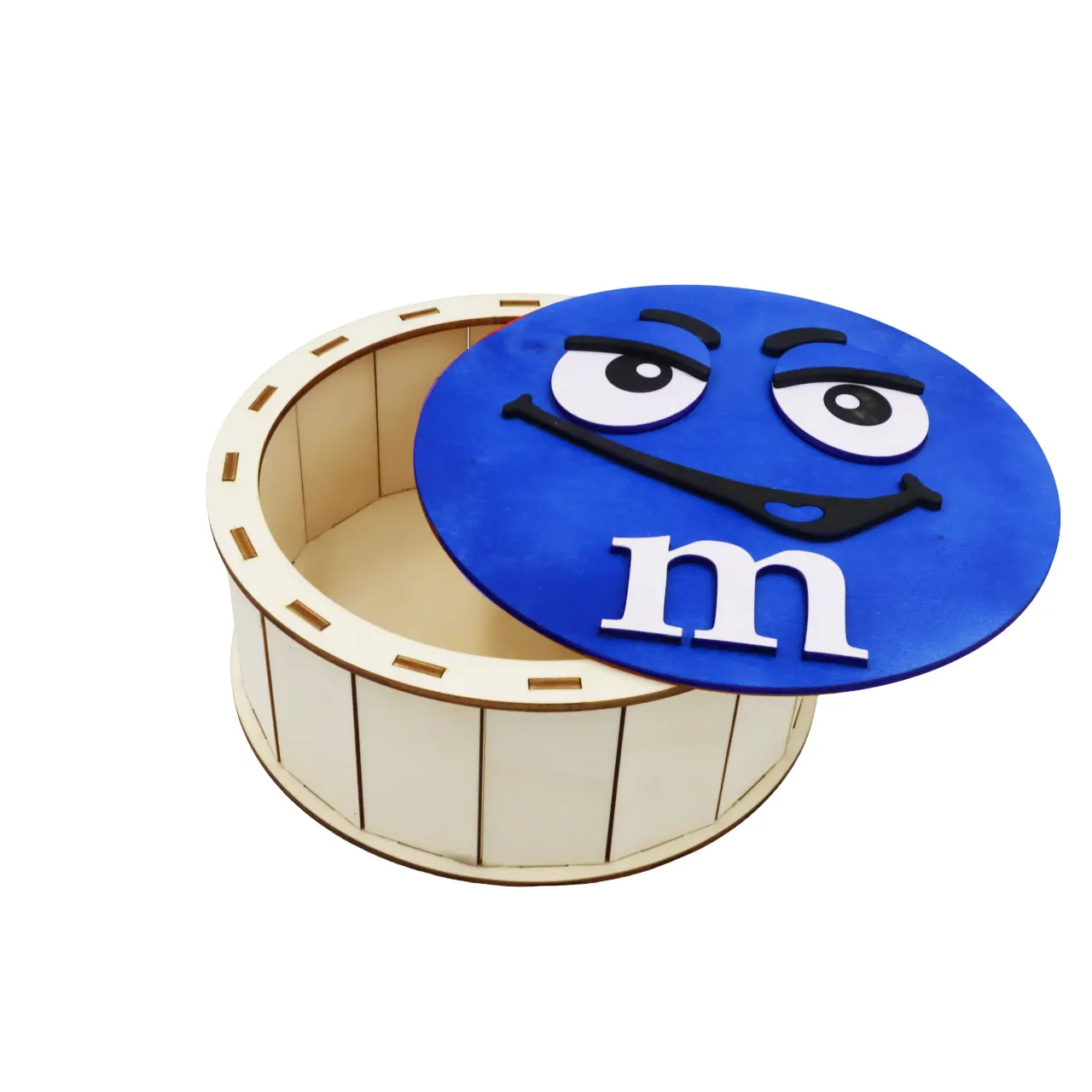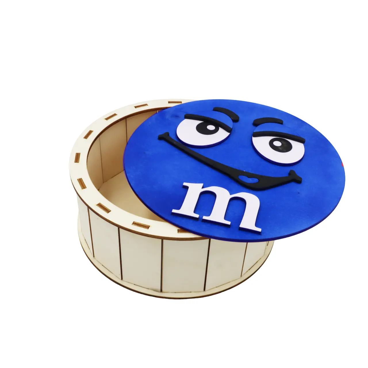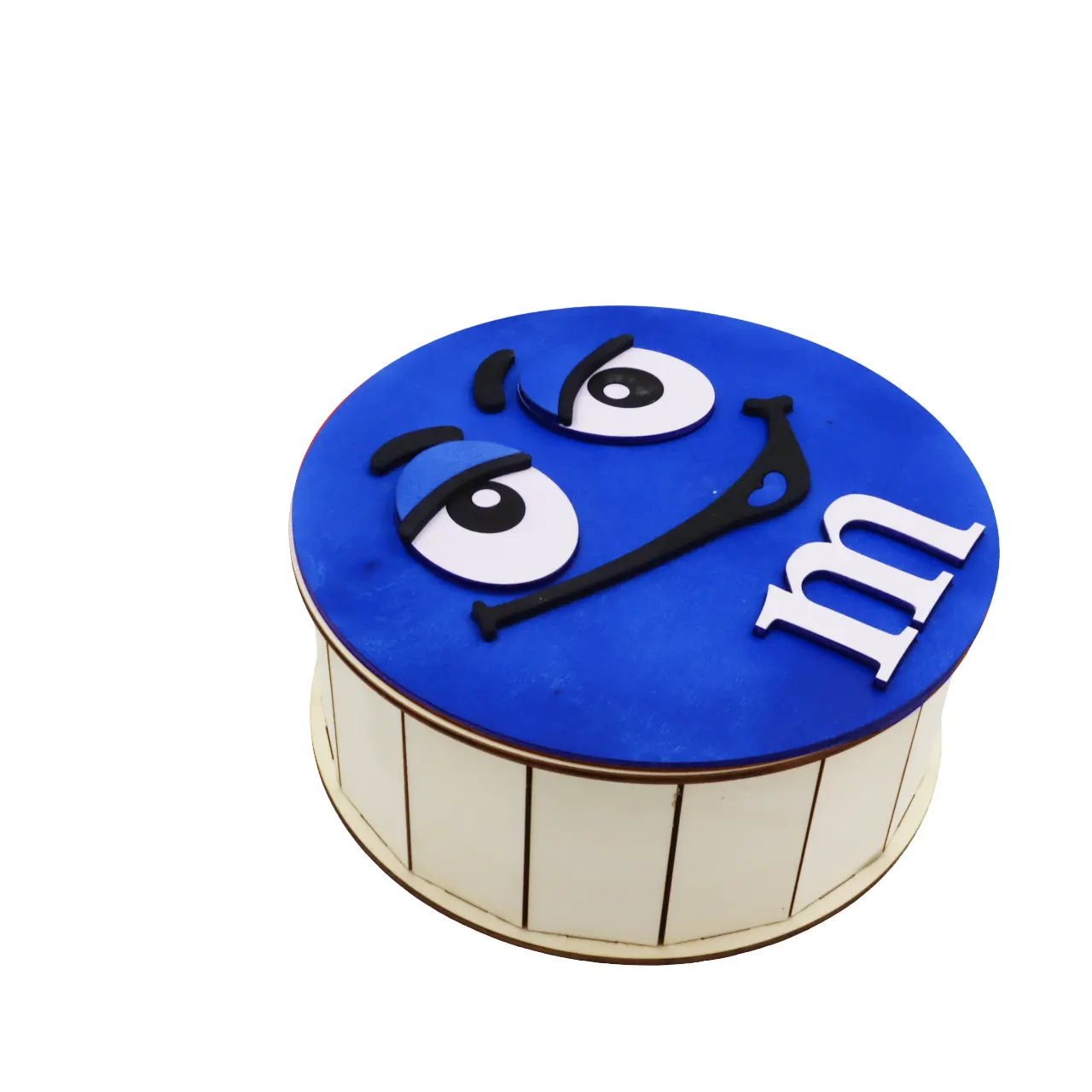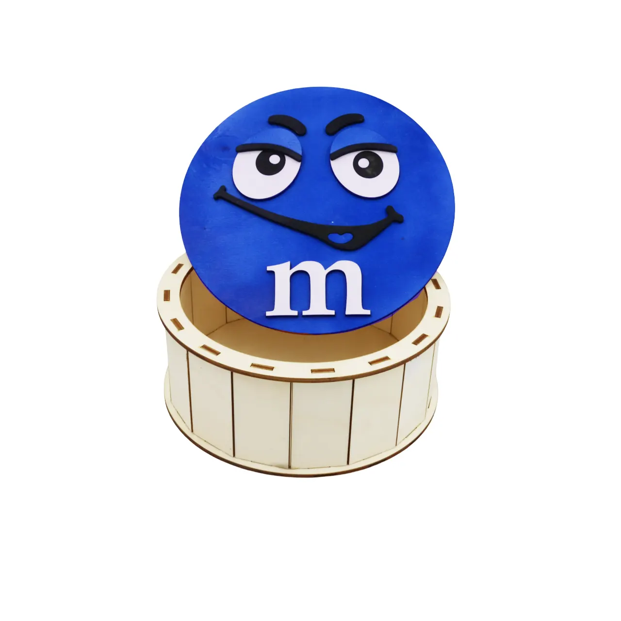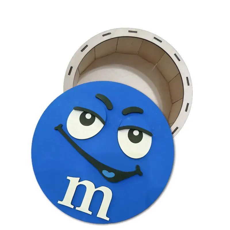 Cutie de cadouri cu capac,rotund tematica mister M m&m, perfecta pentru a oferi cadou unor copii de Craciun, Paste, Zile de Nastere etc, si pentru a pastra dulciuri sau alte obiecte.