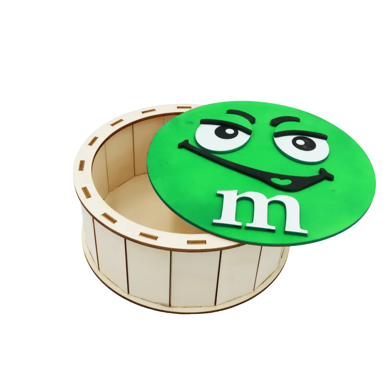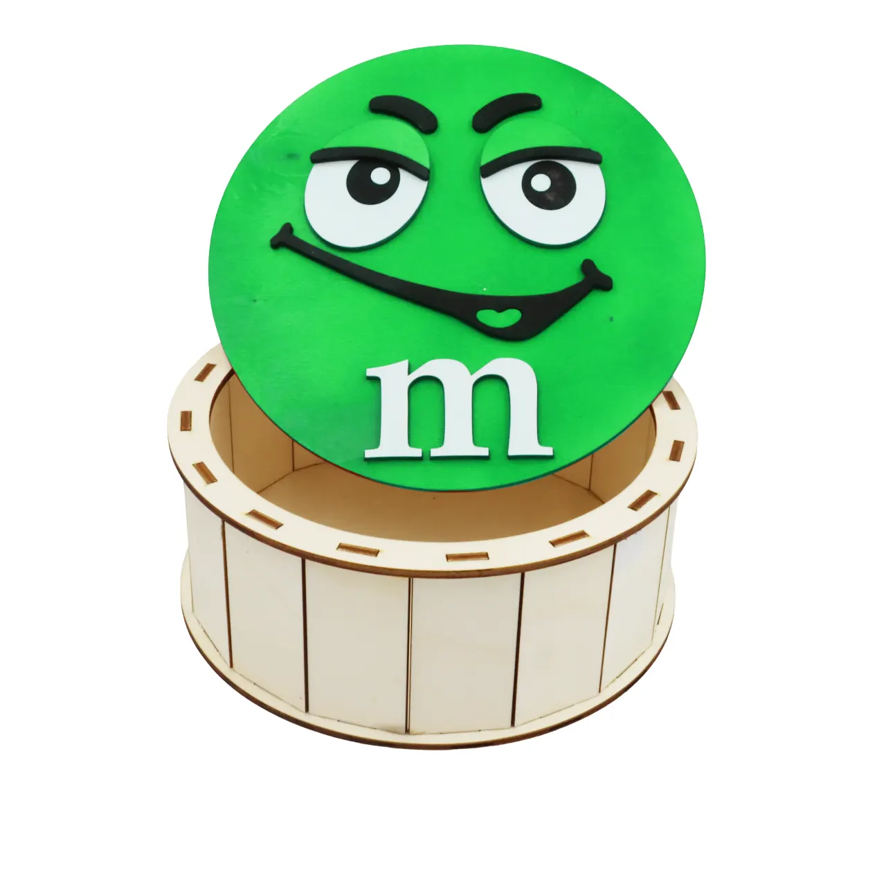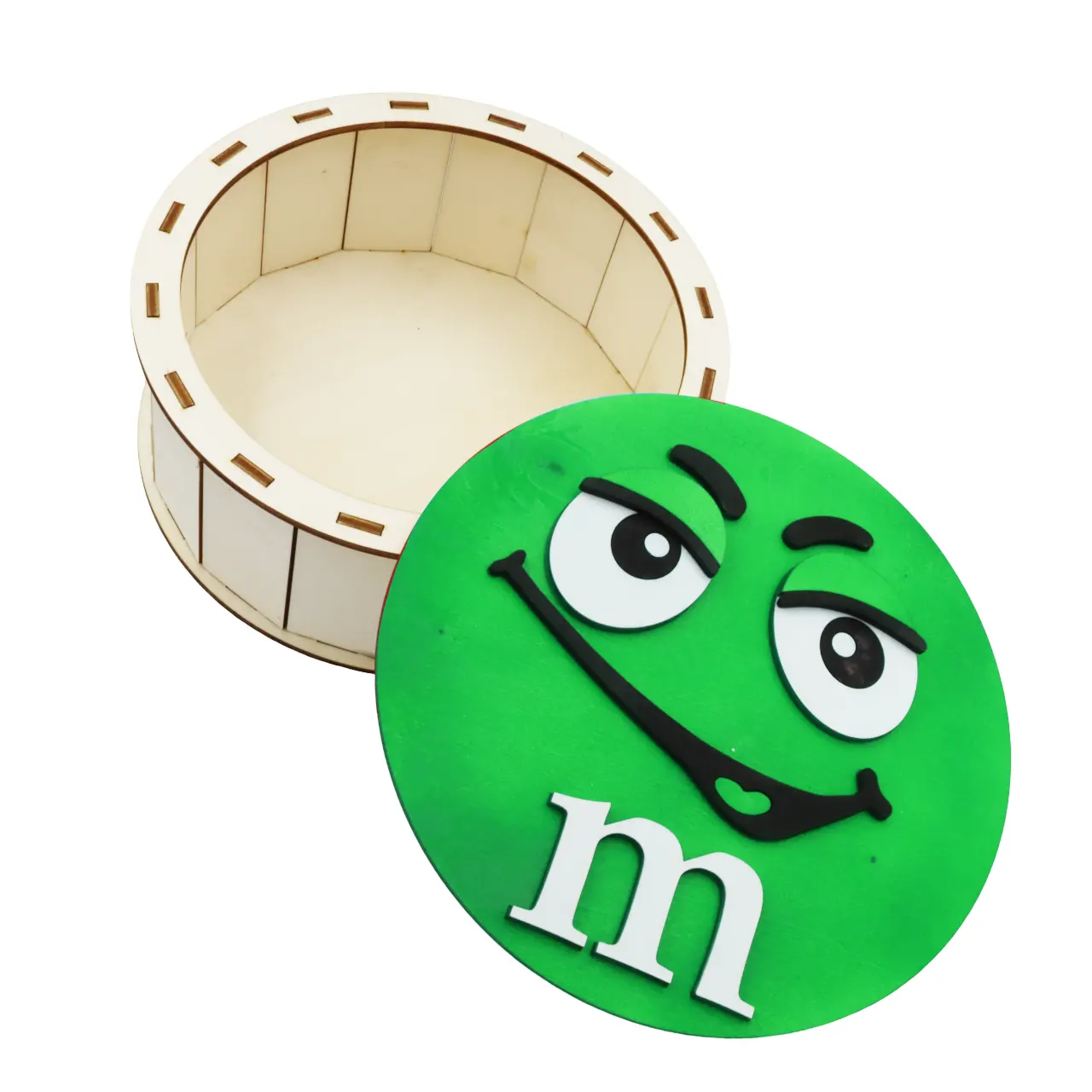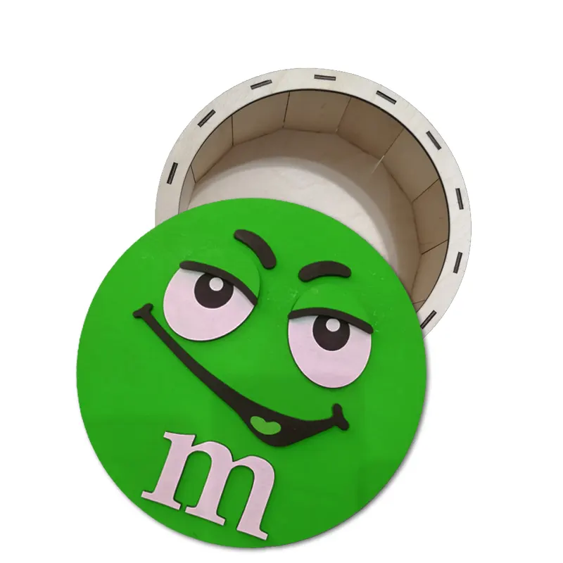 Cutie de cadouri cu capac,rotund tematica mister M m&m, perfecta pentru a oferi cadou unor copii de Craciun, Paste, Zile de Nastere etc, si pentru a pastra dulciuri sau alte obiecte.