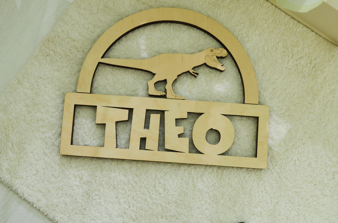 Decoratiune pentru usa/ perete camera copil personalizat cu nume, model Trex, dimensiune 35x35cm