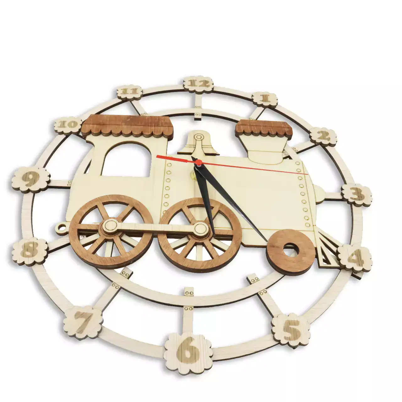 Ceas din lemn personalizat cu nume/mesaj si poza, pentru copii,30 cm, woodmag, model locomotiva, wdmc16