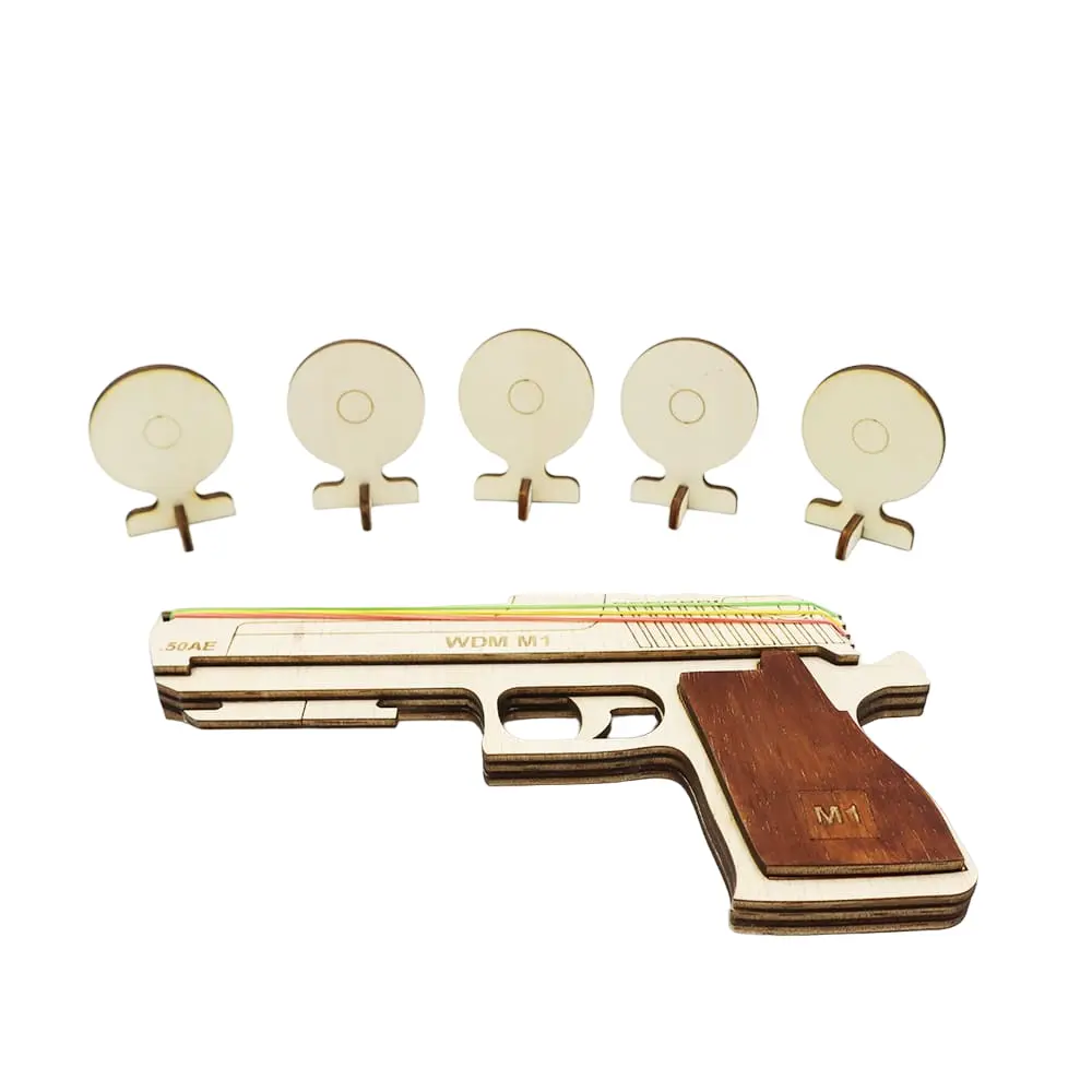 Pistol de lemn cu elastice WoodMag M1 + 5 tinte rotunde